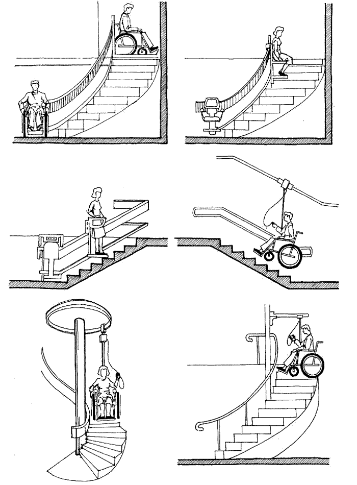 • Лестницы в зданиях • Поручни перил и ограждений • Индивидуальные подъемники • Индивид. подъемники (сх. работы) • Лифты • Размеры входных тамбуров • Оборудование дверных проемов • Дверные ручки • Коридоры и входы в помещения |